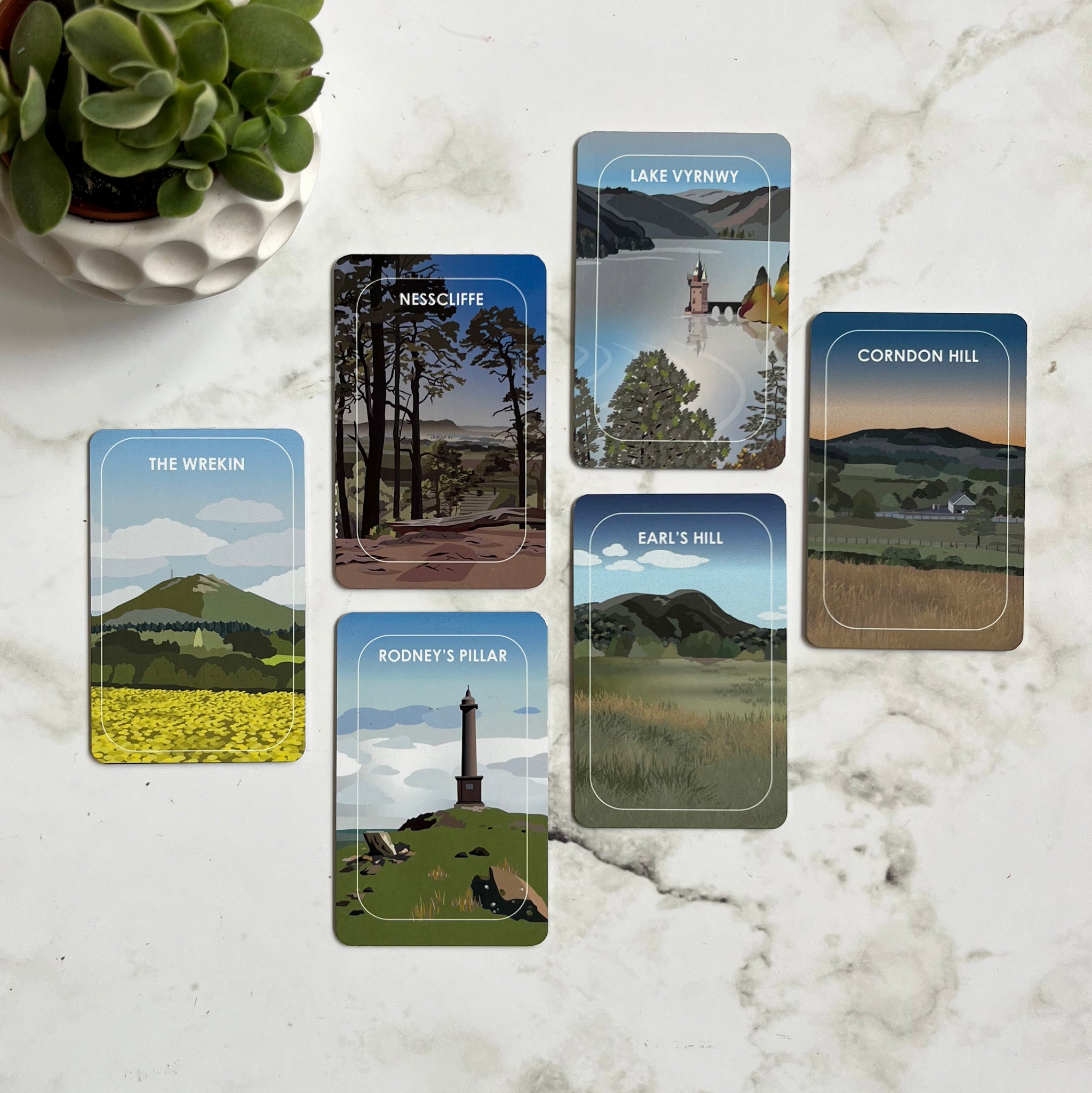 Metal fridge magnets featuring designs from our travel prints: Rodney's Pillar, The Wrekin, Lake Vyrnwy, Nesscliffe, Earl's Hill and Corndon Hill.