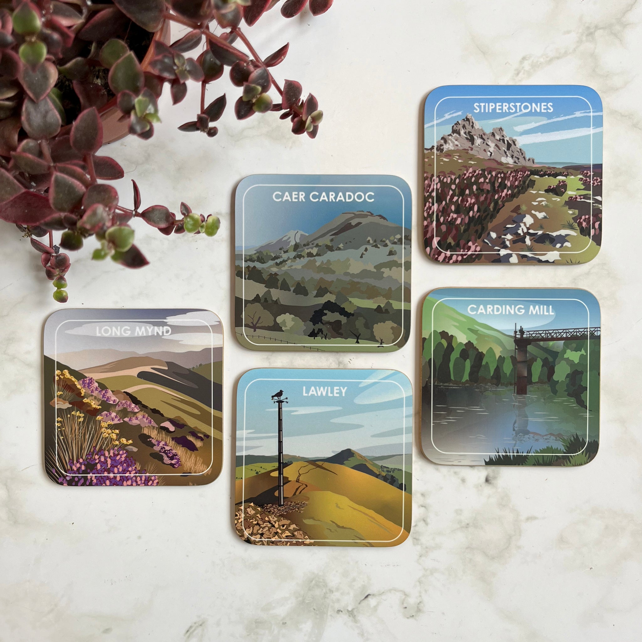 Our travel designs of Shropshire hills digitally printed on 9cm square coasters with a matt finish.